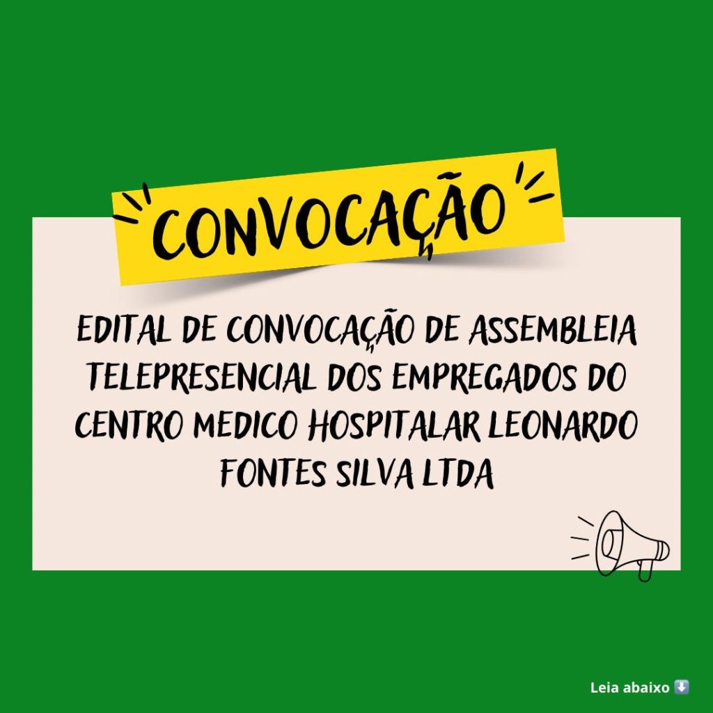 A diretoria do SINDICATO DOS EMPREGADOS EM ESTABELECIMENTOS DE SERVIÇOS DE SAÚDE DO ESTADO DA PARAÍBA – SINDESEP-PB, com fundamento nos estatutos do sindicato e na legislação pertinente a matéria, especialmente a legislação trabalhista, convoca todos os empregados do CENTRO MEDICO HOSPITALAR LEONARDO FONTES SILVA LTDA, representados pelo sindicato, para uma assembleia extraordinária a ser realizada no dia 24 de setembro de 2024, uma terça-feira, com início previsto para às 16 horas e encerramento previsto para às 17 horas do mesmo dia, a ser realizada de forma telepresencial pelo sistema/aplicativo Microsoft Teams, cujo link será disponibilizado em todas as redes sociais oficias do Sindesep ( site/Instagram) assim como para os dispositivos eletrônicos dos empregados através dos grupos de WhatsApp.
